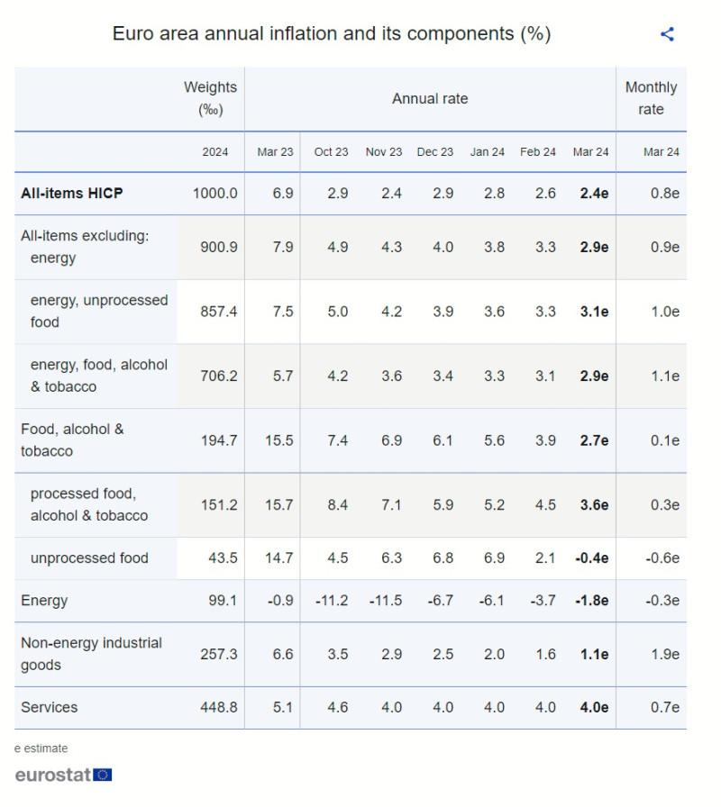 Εξετάζοντας τις κύριες συνιστώσες του πληθωρισμού της ζώνης του ευρώ, οι υπηρεσίες είχαν τον υψηλότερο ετήσιο ρυθμό τον Μάρτιο (4,0%, σταθερός σε σχέση με τον Φεβρουάριο), ακολουθούμενες από τα τρόφιμα, το αλκοόλ και τον καπνό (2,7%, έναντι 3,9% τον Φεβρουάριο), τα μη ενεργειακά βιομηχανικά αγαθά (1,1%, έναντι 1,6% τον Φεβρουάριο) και την ενέργεια (-1,8%, έναντι -3,7% τον Φεβρουάριο).
