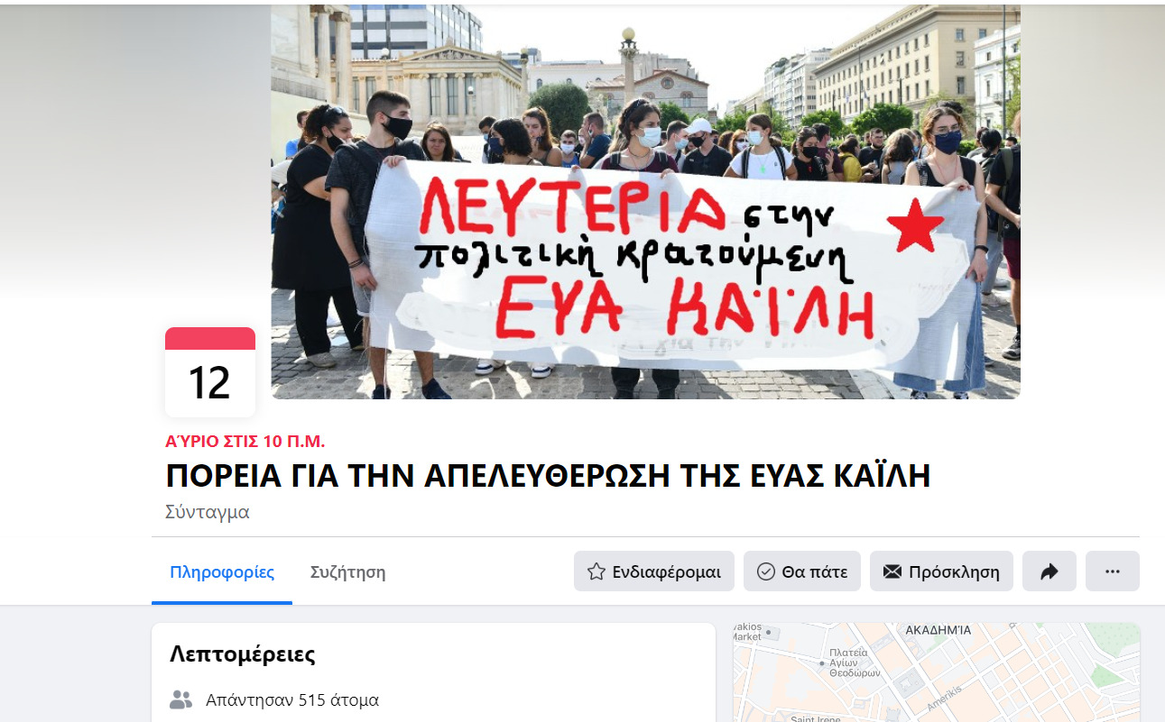 Ταυτόχρονα, οι χρήστες του Facebook “οργανώνουν πορεία” για την απελευθέρωση της Εύας Καϊλή, με τη δημιουργία εκδήλωσης.