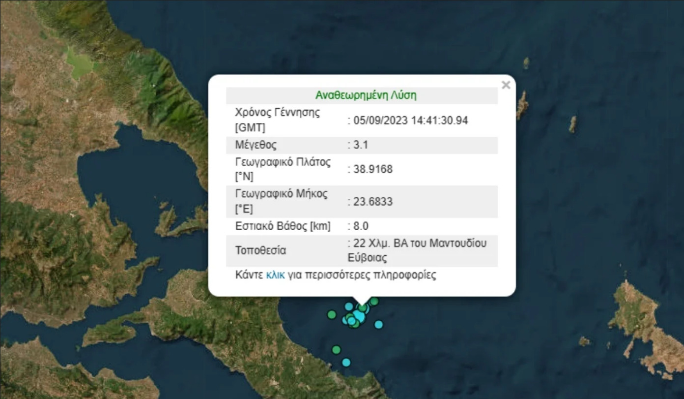 Σεισμός μεγέθους 3,1 βαθμών της κλίμακας Ρίχτερ σημειώθηκε το απόγευμα της Τρίτης (5/9) ανοιχτά του Μαντουδίου Ευβοίας.