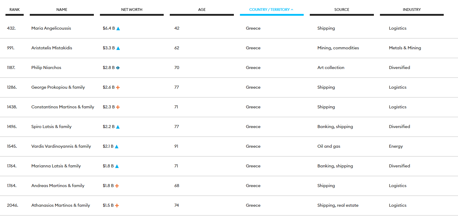 Πρώτη εμφανίζεται η Μαρία Αγγελικούση, της οποίας η περιουσία εκτοξεύτηκε από 5,6 δισ. δολάρια πέρυσι σε 6,4 δισ. δολάρια φέτος. Έτσι, η εφοπλίστρια καταλαμβάνει την 432η θέση παγκοσμίως.