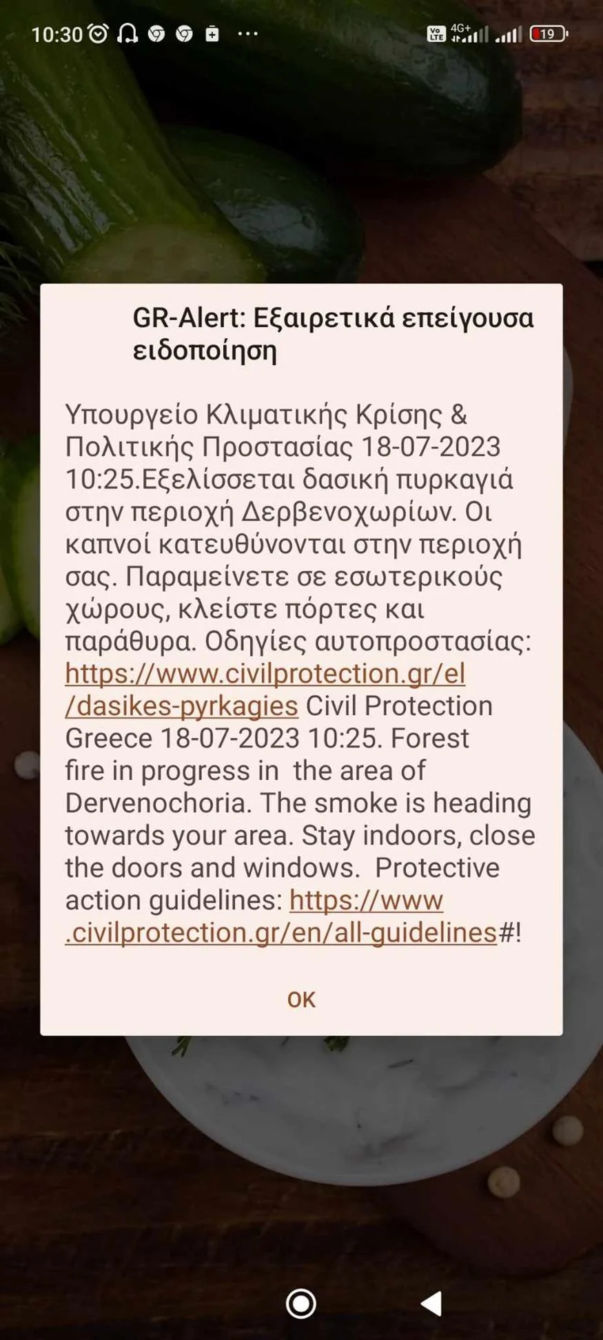 Συγκεκριμένα, το μήνυμα αναφέρει: «Εξελίσσεται δασική πυρκαγιά στην περιοχή Δερβενοχωρίων.