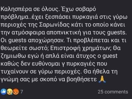 Τι προβλέπεται και τι θεωρείτε σωστό; Επιστροφή χρημάτων; Θα ζημιωθώ εγώ ή απλά είναι άτυχος ο guest καθώς δεν ευθύνομαι για πυρκαγιές που τυχαίνουν σε γύρω περιοχές. Θα ήθελα την γνώμη σας με σκοπό να βοηθήσετε», έγραψε η ιδιοκτήτρια του Airbnb ειδικότερα.