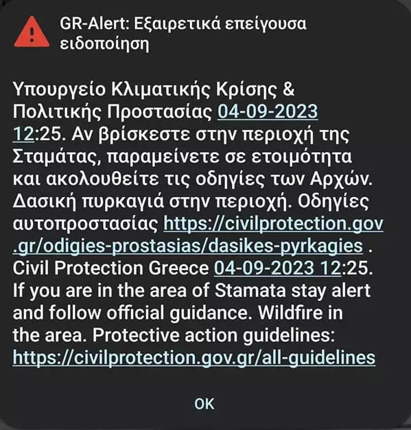 Λίγο πριν τις 12:30 εστάλη μήνυμα του 112 στους κατοίκους της περιοχής, όσοι βρίσκονται στη Σταμάτα να παραμείνουν σε ετοιμότητα.