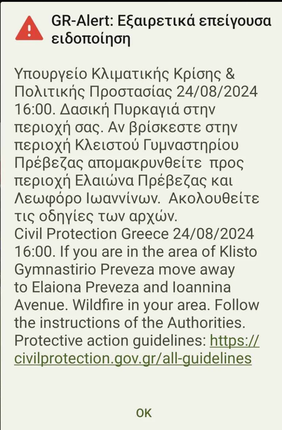Παράλληλα, μήνυμα από το 112 ήχησε στα κινητά των κατοίκων, γράφοντας: «Δασική Πυρκαγιά στην περιοχή σας. Αν βρίσκεστε στην περιοχή Κλειστού Γυμναστηρίου Πρέβεζας απομακρυνθείτε προς περιοχή Ελαιώνα Πρέβεζας και Λεωφόρο Ιωαννίνων».