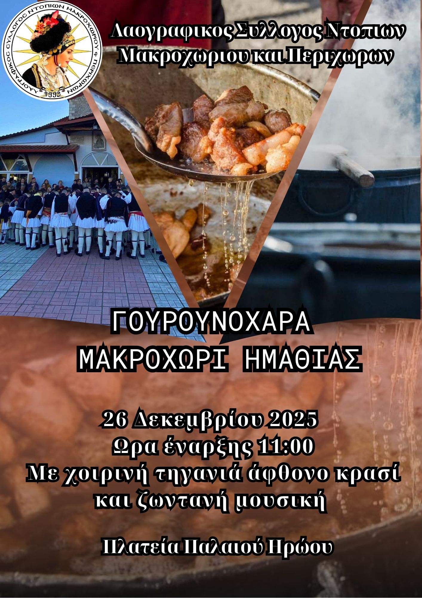 Ο Λαογραφικός Σύλλογος Ντόπιων Μακροχωρίου και Περιχώρων σας προσκαλεί στη φετινή Γουρνοχαρά, ένα από τα αρχαιότερα έθιμα της Μακεδονίας, που κρατάει ζωντανή τη μακεδονική παράδοση και το πνεύμα των Χριστουγέννων.
