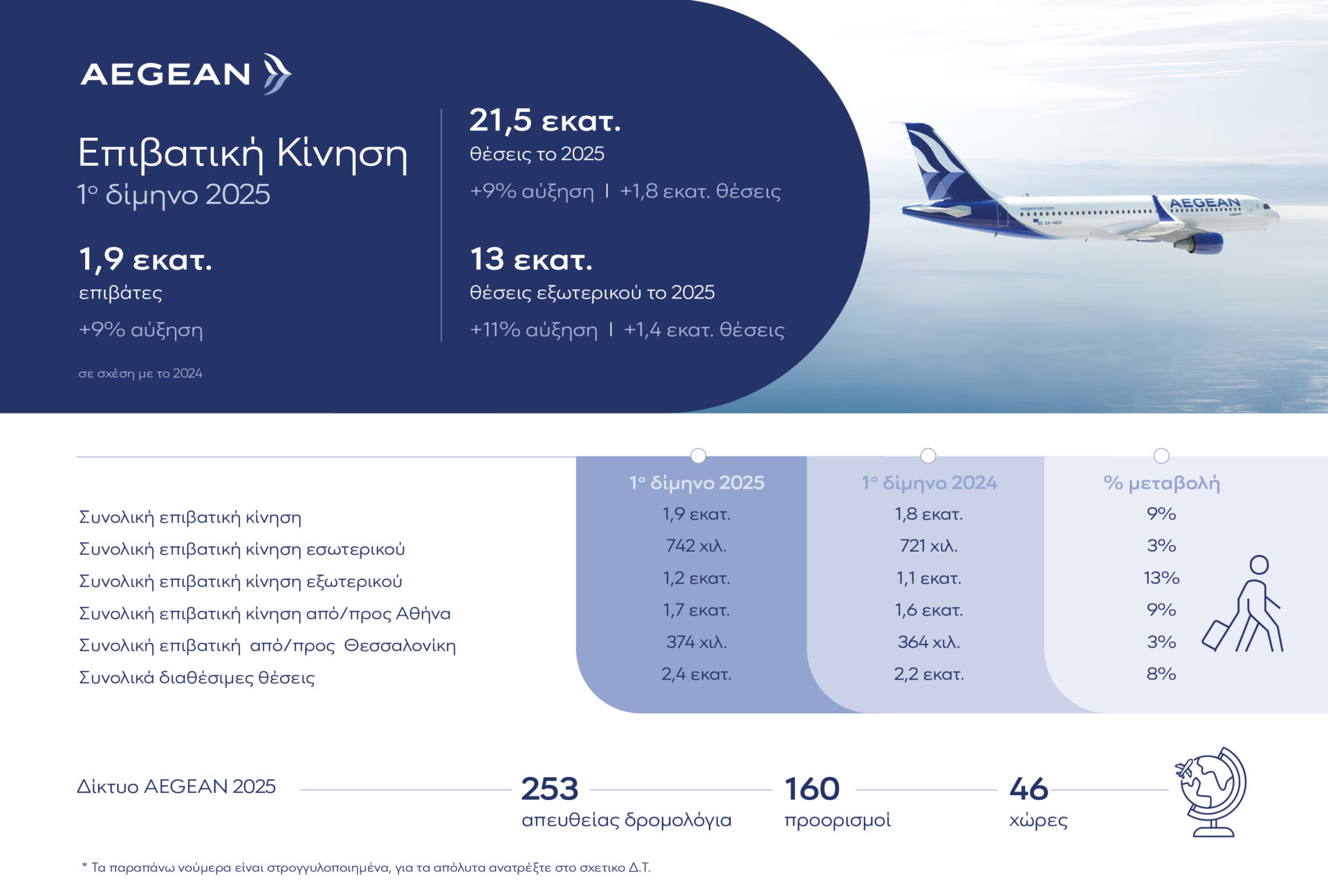 Για το 2025, η AEGEAN συνεχίζοντας τη στρατηγική ενίσχυσης της δραστηριότητάς της θα προσφέρει περίπου 21,5 εκατ. θέσεις, δηλαδή 1,8 εκατ. θέσεις περισσότερες σε σχέση με το 2024. Ειδικότερα, θα προσφέρει περίπου 13 εκατ. θέσεις στο δίκτυο εξωτερικού, ξεπερνώντας τις 1,4 περισσότερες θέσεις συγκριτικά με το 2024 και 8,5 εκατ. θέσεις στο δίκτυο εσωτερικού, περίπου 6% περισσότερες.