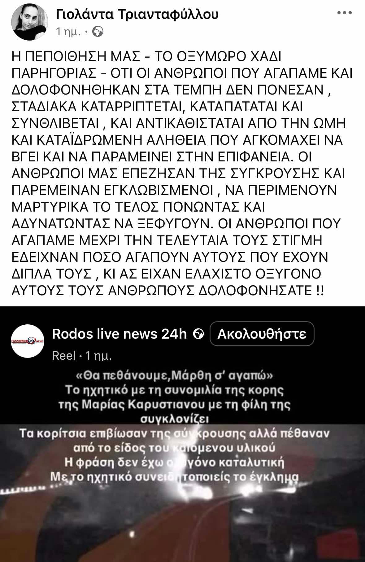 Το σοκαριστικό αυτό ηχητικό, σχολίασε η Γιολάντα Τριανταφύλλου, φίλη της 19χρονης Μάρθης και της 20χρονης Φραντσέσκας, που έχασαν τη ζωή τους εκείνο το βράδυ, τονίζοντας πως οι φίλες της, όπως και τα υπόλοιπα άτομα που βρίσκονταν μαζί τους στο βαγόνι «παρέμειναν εγκλωβισμένοι, να περιμένουν μαρτυρικά το τέλος, πονώντας και αδυνατώντας να ξεφύγουν».
