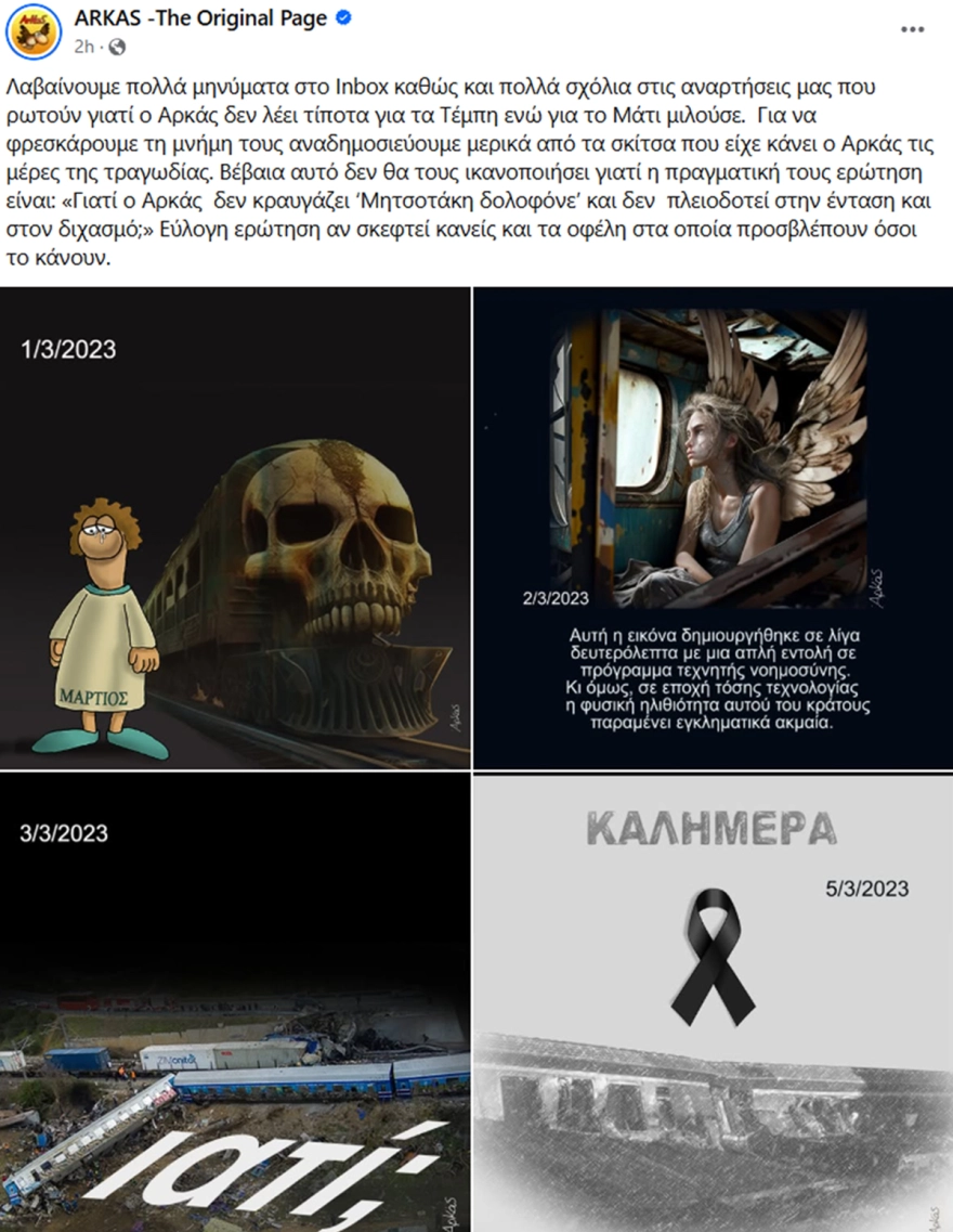 «Λαβαίνουμε πολλά μηνύματα στο Inbox καθώς και πολλά σχόλια στις αναρτήσεις μας που ρωτούν γιατί ο Αρκάς δεν λέει τίποτα για τα Τέμπη ενώ για το Μάτι μιλούσε. Για να φρεσκάρουμε τη μνήμη τους αναδημοσιεύουμε μερικά από τα σκίτσα που είχε κάνει ο Αρκάς τις μέρες της τραγωδίας. Βέβαια αυτό δεν θα τους ικανοποιήσει γιατί η πραγματική τους ερώτηση είναι: «Γιατί ο Αρκάς δεν κραυγάζει ‘Μητσοτάκη δολοφόνε’ και δεν πλειοδοτεί στην ένταση και στον διχασμό;» Εύλογη ερώτηση αν σκεφτεί κανείς και τα οφέλη στα οποία προσβλέπουν όσοι το κάνουν».