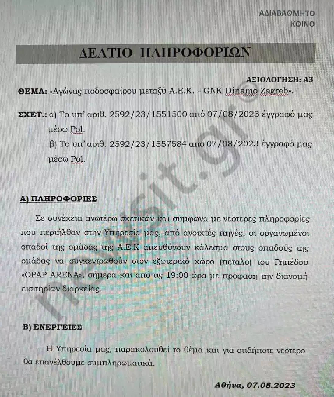Στο πρώτο απόρρητο Ενημερωτικό Σημείωμα που αποκαλύπτει το newsit.gr, οι έμπειροι αξιωματικοί του Τμήματος Καταπολέμησης Αθλητικής Βίας που φέρει με ημερομηνία 6/8/ 2023, τίτλο: Αξιολόγηση: Α3 και θέμα: Αγώνας ποδοσφαίρου μεταξύ ΑΕΚ – GΝΚ Dinamo Zagreb επισημαίνουν τα εξής αναφορικά με τις πληροφορίες που έλαβαν από τις ξένες αρχές: «Την Τρίτη 8/8/ 2023 και ώρα 21:45, είναι προγραμματισμένος να διεξαχθεί ο αγώνας ποδοσφαίρου για τον 3ο προκριματικό γύρο του Champions League μεταξύ ομάδων ΑΕΚ – GΝΚ Dinamo Zagreb στο γήπεδο OPAP ARENA. Σύμφωνα με το Εθνικό Γραφείο Πληροφοριών της Κροατίας, αναμένεται να ταξιδέψουν προς την χώρα μας περί τους 150 οπαδούς της GΝΚ Dinamo Zagreb. Σύμφωνα με πληροφορίες που περιήλθαν στην υπηρεσία μας από πηγή συνήθους αξιοπιστίας και οι οποίες διαρκώς ελέγχονται, στην χώρα μας θα αφιχθή ικανός αριθμός περίπου – 100 οργανωμένων οπαδών της GΝΚ Dinamo Zagreb – BAD BLUE BOYS- κάποιοι εκ των οποίων θα φιλοξενηθούν από οπαδούς της ομάδας του Παναθηναϊκού με τους οποίους είναι αδελφοποιημένοι και διατηρούν εξαιρετικές σχέσεις και επικοινωνία και κάποιοι θα διαμένουν σε διάφορα καταλύματα Airbnb κυρίως πλησίον της λεωφόρου Αλεξάνδρας. Επιπλέον ενδέχεται μικρός αριθμός αυτών να φιλοξενηθούν στα κεντρικά γραφεία του ΠΑΝ.ΚΙ επί της Λ. Αλεξάνδρας αριθμός 115 τα οποία αναμένεται να ανοίξουν απογευματινές ώρες 7/8/2023 και να συγκεντρωθεί ικανός αριθμός ατόμων. Ενέργειες: υπηρεσία μας παρακολουθεί το θέμα και για οποιοδήποτε νεότερο θα επανέλθουμε συμπληρωματικά».