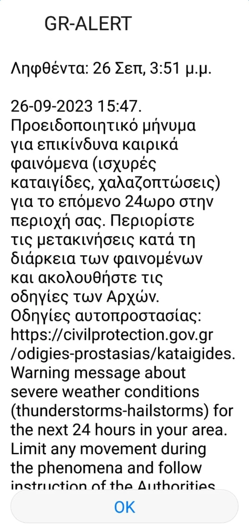 Στο μήνυμα αναφέρεται ότι επίκεινται επικίνδυνα καιρικά φαινόμενα στην περιοχή