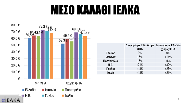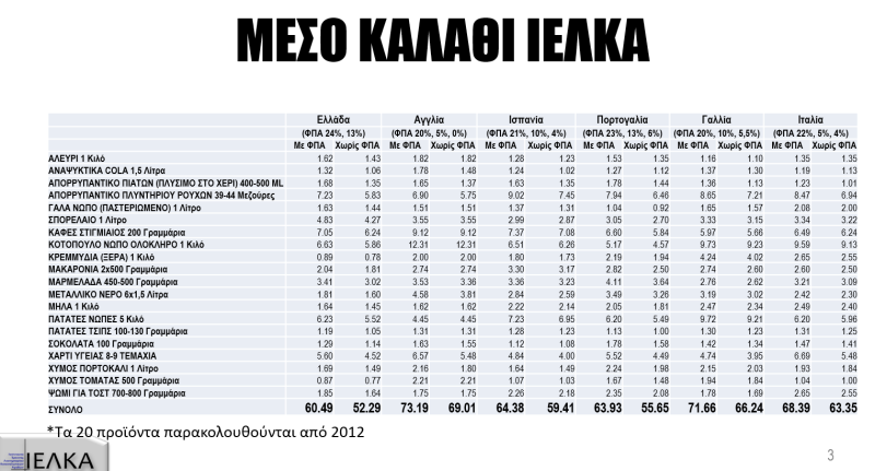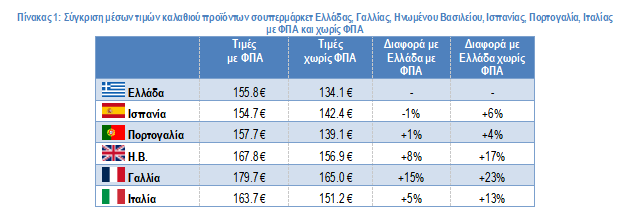 Η εικόνα των αποτελεσμάτων, όπως αναφέρει ο ΙΕΛΚΑ, αλλάζει σημαντικά όταν αφαιρέσουμε τον ΦΠΑ ανά χώρα, καθώς γίνονται αντιληπτές οι πραγματικές τιμές των προϊόντων σουπερμάρκετ. Η σύγκριση των καλαθιών σε αυτή την περίπτωση δείχνει ότι οι και οι έξι χώρες έχουν πιο ακριβό μέσο καλάθι από την Ελλάδα, η Γαλλία κατά 23%, το Ηνωμένο Βασίλειο κατά 17%, η Ιταλία κατά 13%, η Ισπανία κατά 6% και η Πορτογαλία κατά 4%.