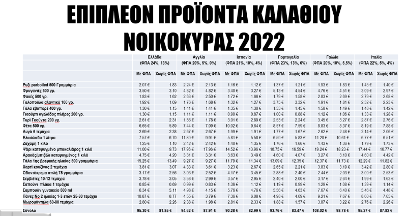 Η έρευνα πραγματοποιήθηκε τον Νοέμβριο και τον Δεκέμβριο του 2022, και η σύγκριση έγινε με και χωρίς την αξία του ΦΠΑ, ο οποίος διαφέρει σε κάθε χώρα σε συνολικά 41 κατηγορίες προϊόντων από το «καλάθι του νοικοκυριού» . Όπως προκύπτει λοιπόν, από τα αποτελέσματα της έρευνας, πιο ακριβό καλάθι σε σχέση με την Ελλάδα έχουν η Γαλλία 15%, το Ηνωμένο Βασίλειο 8% και η Ιταλία 5%. Οι άλλες δύο χώρες δηλαδή η Ισπανία και η Πορτογαλία έχουν περίπου ίσο καλάθι με την Ελλάδα. Δηλαδή, 1% ακριβότερο η Πορτογαλία και 1% φθηνότερο η Ισπανία.
