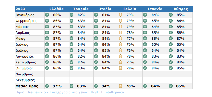 Τον Οκτώβριο του 2023, η Ελλάδα κατέχει την πρώτη θέση στο γενικό δείκτη ικανοποίησης (GRI) των ξενοδοχείων με 86%.