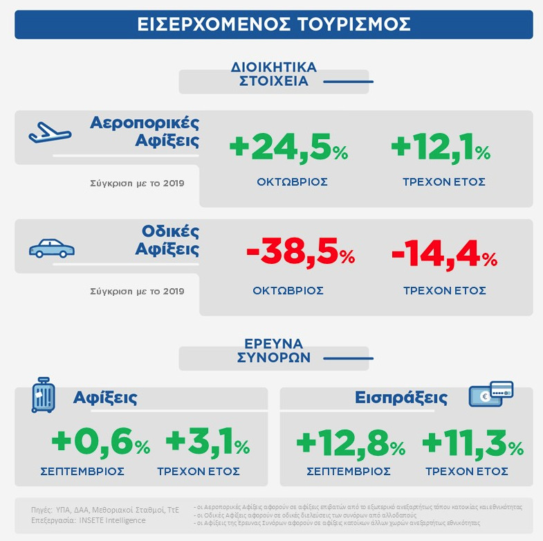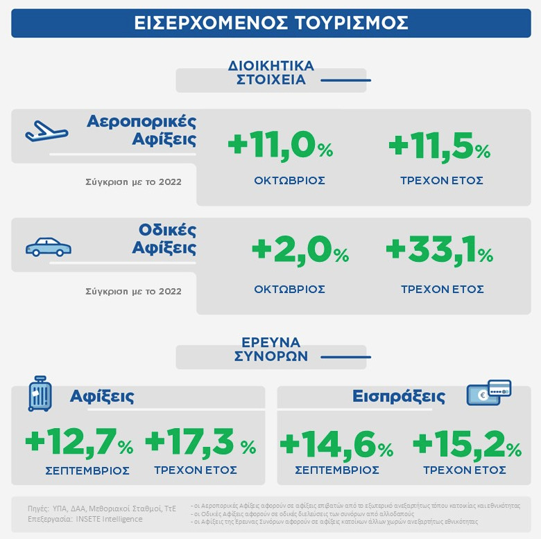 Ελλάδα «ψήφισαν» και τον Οκτώβριο οι τουρίστες. Σύμφωνα με τα στοιχεία του Ινστιτούτου του Συνδέσμου Ελληνικών Τουριστικών Επιχειρήσεων (ΙΝΣΕΤΕ), τον Οκτώβριο σημειωθήκαν 2 εκατ. αφίξεις καταγράφοντας αύξηση 11,0% σε σχέση με τον Οκτώβριο του 2022 και 24,5% σε σχέση με τον Οκτώβριο του 2019.
