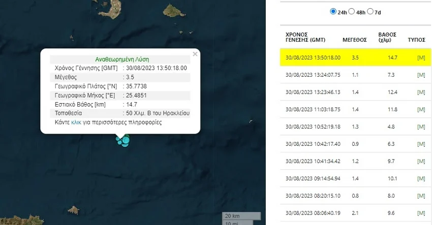 Σύμφωνα με το Αστεροσκοπείο Αθηνών η δόνηση είχε επίκεντρο 50χλμ Βόρεια του Ηρακλείου και το εστιακό βάθος ήταν 14.7χλμ.