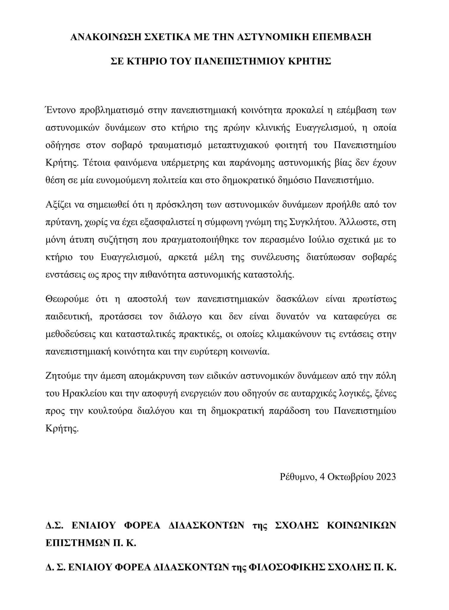 «Τέτοια φαινόμενα υπέρμετρης και παράνομης αστυνομικής βίας δεν έχουν θέση σε μια ευνομούμενη πολιτεία και στο δημοκρατικό δημόσιο Πανεπιστήμιο» αναφέρει μεταξύ άλλων η ανακοίνωση.