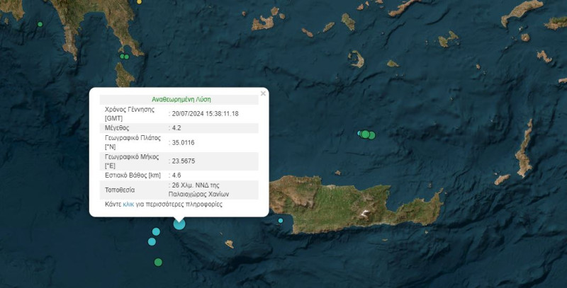Σεισμική δόνηση 4,2 βαθμών της κλίμακας Ρίχτερ σημειώθηκε στις 18:38 το απόγευμα του Σαββάτου (20/07) 26χλμ ΝΔ της Παλαιόχωρας Χανίων.