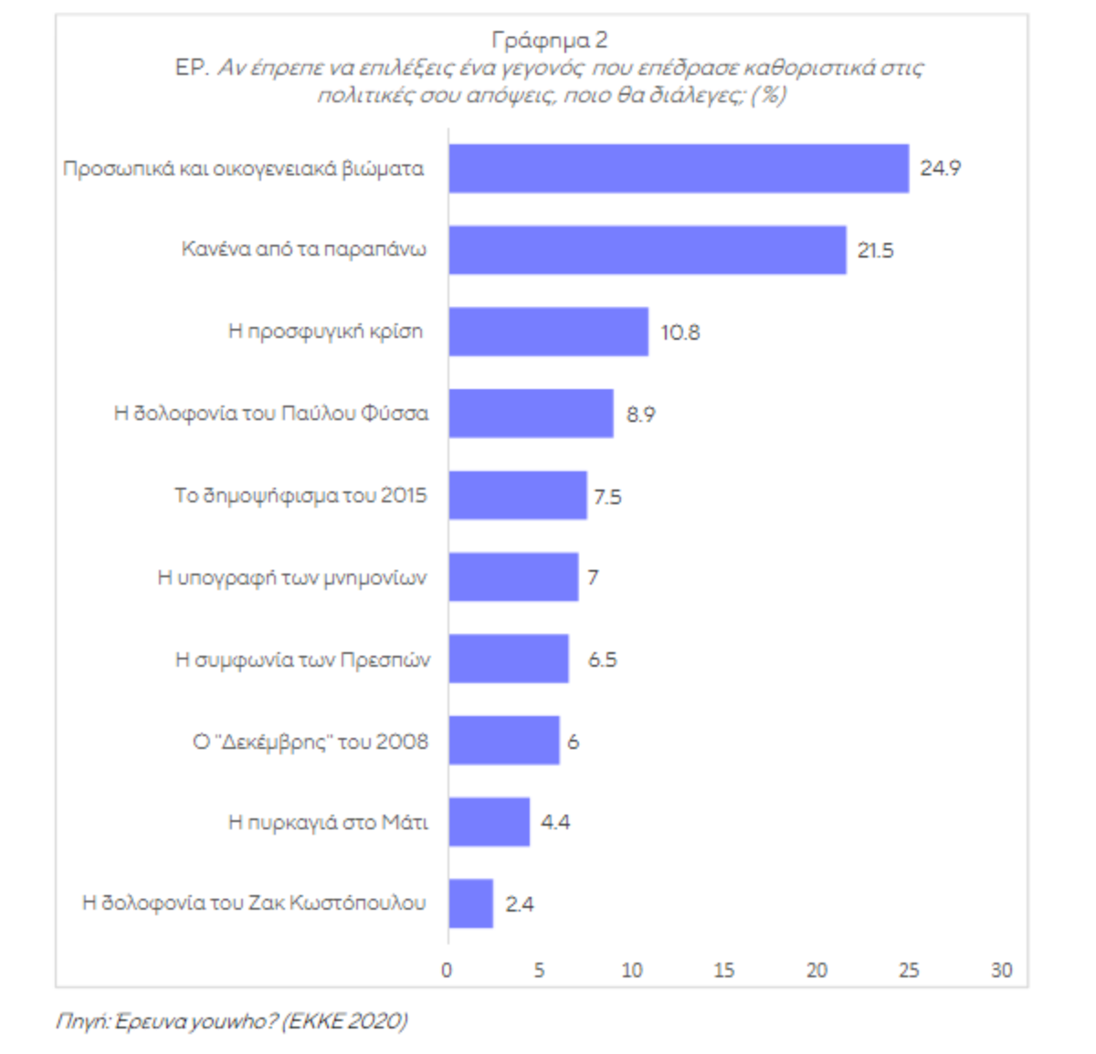 Η επικεφαλής της έρευνας, Μανίνα Κακεπάκη, κύρια Ερευνήτρια στο Ινστιτούτο Πολιτικών Ερευνών, Εθνικό Κέντρο Κοινωνικών Ερευνών εξηγεί πως σε σχετική ερώτηση έρευνας του ΕΚΚΕ το 2020 σε νέους/ες ηλικίας 17 έως 29 ετών, ζητήθηκε από τους/τις ερωτώμενους/ες να επιλέξουν από μια λίστα το γεγονός το οποίο συνέβαλε στη διαμόρφωση των πολιτικών τους απόψεων. Μια από τις επιλογές της λίστας ήταν και ο ‘Δεκέμβρης του ΄08’.