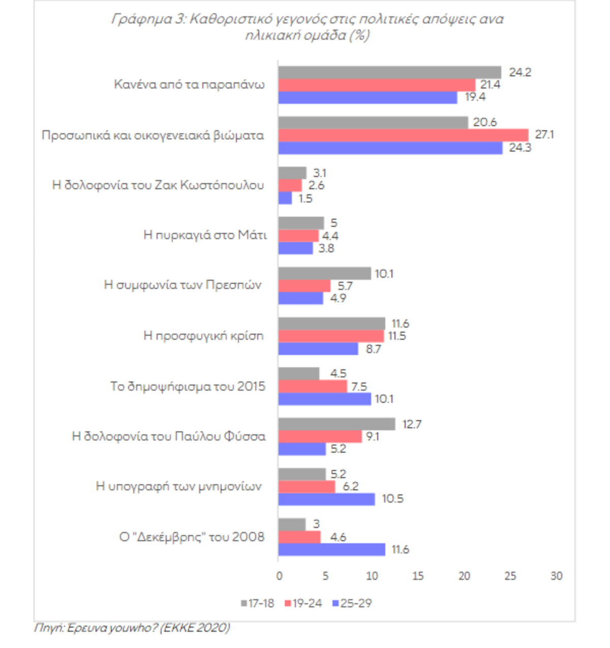 Σύμφωνα με το συμπέρασμα της έρευνας: «η νεότητα δεν αποτελεί μια ενιαία και αδιαίρετη κοινωνική κατηγορία. Όσοι και όσες βρίσκονται μεταξύ 25-29 ετών, βίωσαν σε εντελώς άλλο στάδιο της ζωής τους ορισμένα γεγονότα, με συνέπεια να τους έχουν πολύ περισσότερο καθορίσει. Ο ‘Δεκέμβρης του ‘08’, τα μνημόνια και, ως ένα βαθμό, το δημοψήφισμα, φαίνεται πως άφησαν εντονότερο το αποτύπωμα τους στην συγκρότηση της πολιτικής τους ταυτότητας. Για όσους και όσες βρίσκονται στο κατώφλι της ενηλικίωσης (17-18 ετών), Πρέσπες, Προσφυγικό και δολοφονία Φύσσα είχαν ανάλογη επίδραση. Ωστόσο, τα προσωπικά και οικογενειακά βιώματα διαπερνούν όλες τις ηλικίες και κυριαρχούν στη συνείδηση των νέων ως παράγοντας διαμόρφωσης της πολιτικής τους ταυτότητας»