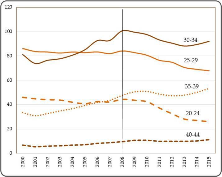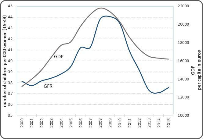 «Η γονιμότητα παρέμεινε σε ιδιαίτερα χαμηλά επίπεδα και μετά το 2000, παρά τη μικρή αύξηση των γεννήσεων που καταγράφηκε κατά την περίοδο 2004-2009, η οποία “ανέβασε” στο 1,5 τον μέσο αριθμό παιδιών ανά γυναίκα. Σημαντικό μέρος αυτής της αύξησης αποδίδεται στην παρουσία αλλοδαπών γυναικών», διευκρινίζει η κ. Τραγάκη, ενώ σε ό,τι αφορά την περίοδο της κρίσης επισημαίνει: «Ο αριθμός των γεννήσεων μειώνεται σταθερά καταγράφοντας αλλεπάλληλα ιστορικά χαμηλά από το 2012 μέχρι και το 2015 οπότε και τα τελευταία διαθέσιμα στοιχεία. Ο συνολικός αριθμός των γεννήσεων το 2015 οριακά ξεπερνά τις 91.000, αριθμός που αντιστοιχεί σε 1,3 παιδιά ανά γυναίκα».
