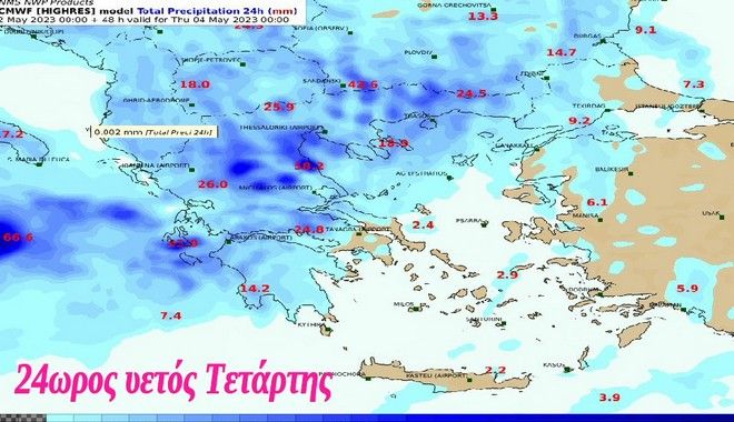 Αύριο Τετάρτη (03-05-2023) ισχυρές βροχές και καταιγίδες θα έχουν α) το Ιόνιο, η δυτική Στερεά, η Θεσσαλία και η κεντρική Μακεδονία. β) έως και τις απογευματινές ώρες έντονα φαινόμενα θα εκδηλωθούν στην Ήπειρο, τη δυτική Μακεδονία, την κεντρική Στερεά και τη δυτική και βόρεια Πελοπόνησο. γ) από τις μεσημβρινές ώρες στην ανατολική Μακεδονία και τη Θράκη.