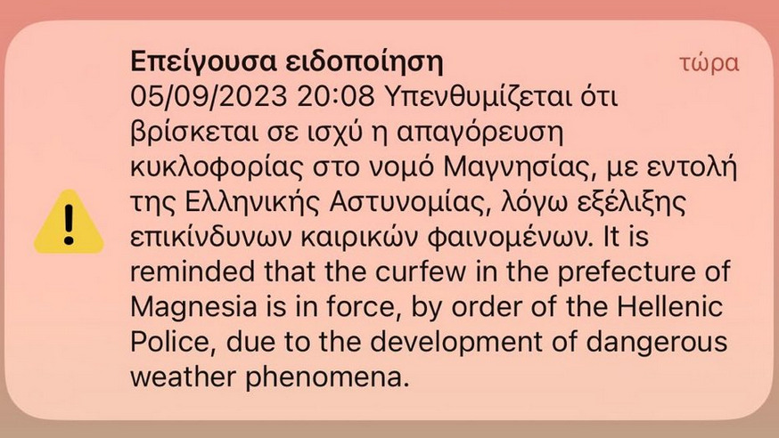 Με νέο μήνυμα, το 112 υπενθυμίζει στους πολίτες της Μαγνησίας ότι βρίσκεται σε ισχύ η απαγόρευση κυκλοφορίας που ανακοινώθηκε εξαιτίας της κακοκαιρίας Daniel. Την ίδια ώρα, νέο μήνυμα εστάλη και στη Λάρισα.