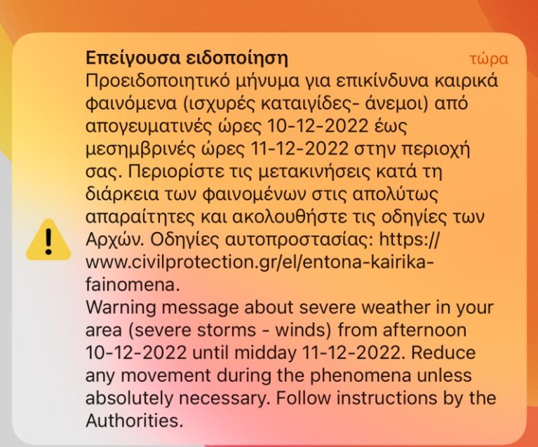 Ειδικότερα, σύστημα κακοκαιρίας με την ονομασία «Gaia» προβλέπεται να επηρεάσει τη χώρα μας από το απόγευμα του Σαββάτου (10-12-2022) και μέχρι τη νύχτα της Κυριακής (11-12-2022) με ισχυρές βροχές και καταιγίδες, μεγάλα ύψη υετού, θυελλώδεις νότιους ανέμους και τοπικές χαλαζοπτώσεις.