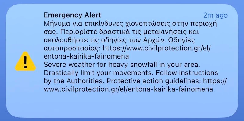 Αναλυτικότερα, το μήνυμα από την Πολιτική Προστασία αναφέρει: «Μήνυμα για επικίνδυνες χιονοπτώσεις στην περιοχή σας. Περιορίστε δραστικά τις μετακινήσεις και ακολουθήστε τις οδηγίες των Αρχών».