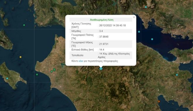 Σεισμική δόνηση έγινε αισθητή, περίπου στις 16:40, σε περιοχές της Αχαΐας. Σύμφωνα με την αναθεωρημένη λύση του Γεωδυναμικού Ινστιτούτου του Εθνικού Αστεροσκοπείου Αθηνών, ο σεισμός είχε μέγεθος 3,4 βαθμών της κλίμακας Ρίχτερ και το επίκεντρο εντοπίστηκε 14 χιλιόμετρα δυτικά, νοτιοδυτικά της Κλειτορίας, στην περιοχή των Καλαβρύτων.