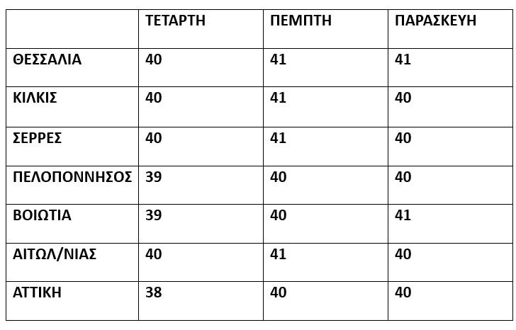 Επισημαίνεται ότι ο Γιώργος Τσατραφύλλιας συνόδευσε την ανάρτησή του με έναν πίνακα, στον οποίο αναγράφονται 7 περιοχές, όπου ο καύσωνας αναμένεται να φτάσει στα κόκκινα και να έχουμε μέχρι και 41 βαθμούς Κελσίου τις επόμενες ημέρες.