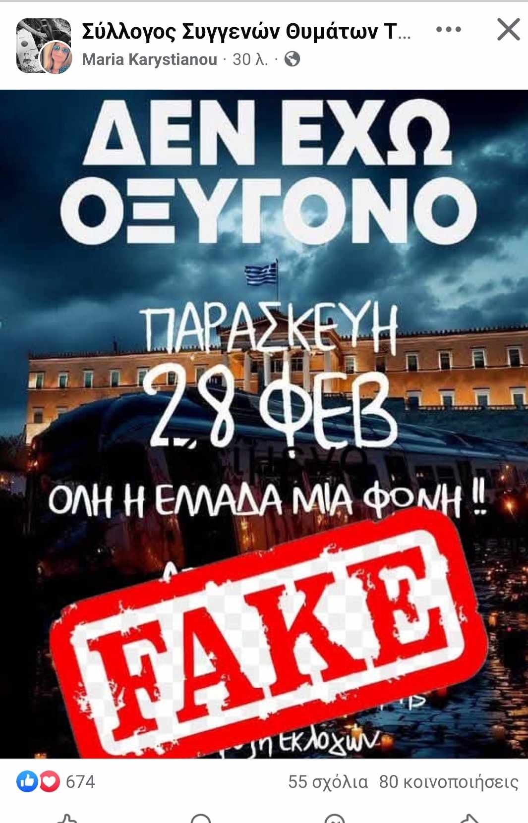 Η μητέρα της 19χρονης Μάρθης που έχασε τη ζωή της το βράδυ της 28ης Φεβρουαρίου 2023, και πρόεδρος του Συλλόγου «Τέμπη 2023» δημοσίευσε τη συγκεκριμένη αφίσα, τοποθετώντας επάνω της την επιγραφή FAKE.