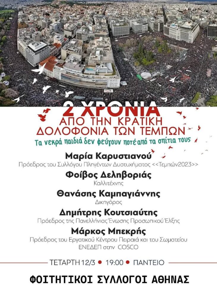 Σε εκδήλωση στο Πάντειο για τη συμπλήρωση δύο ετών από το δυστύχημα στα Τέμπη θα συμμετάσχουν η Μαρία Καρυστιανού και ο Φοίβος Δεληβοριάς.