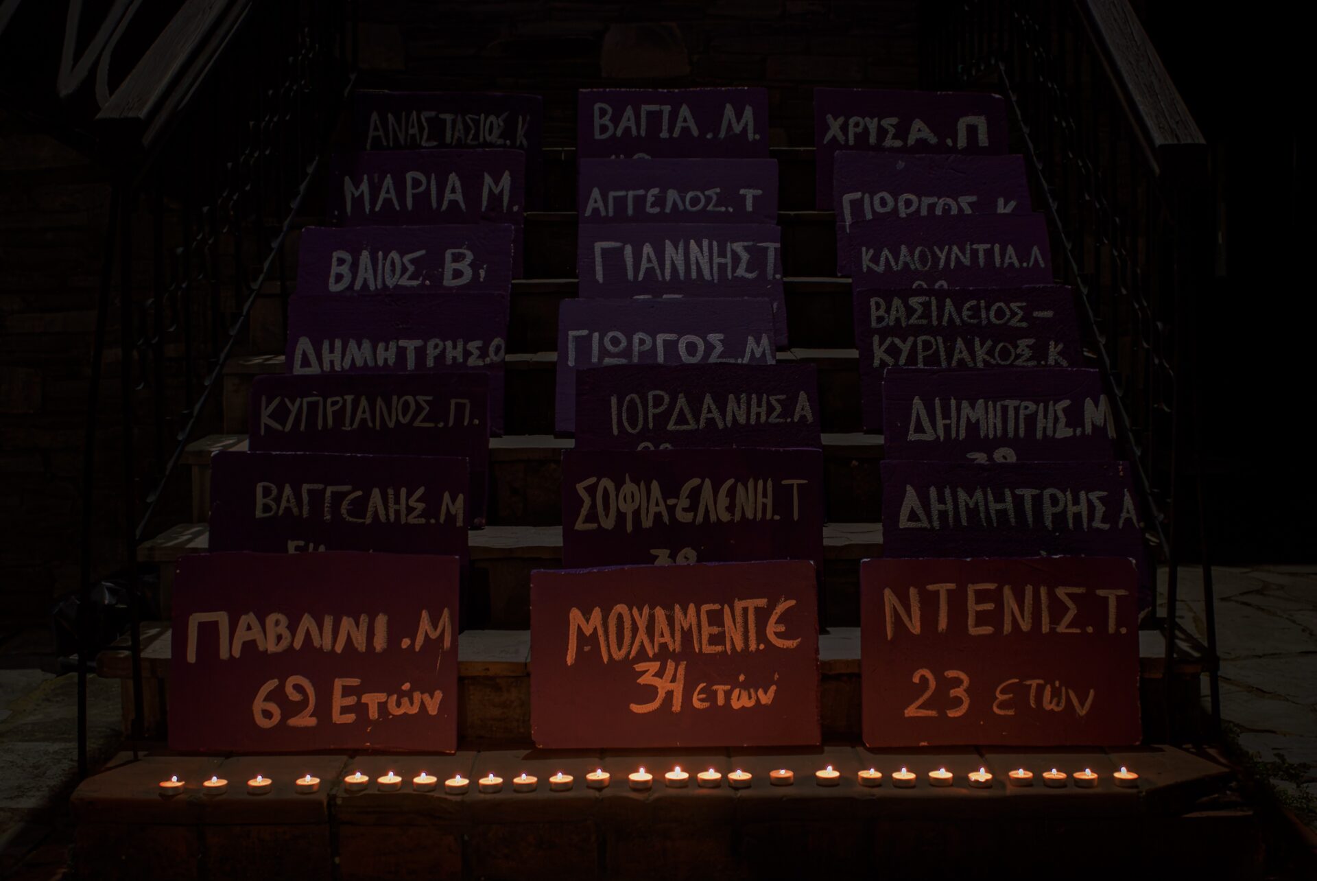 Στην πλατεία του Δημαρχείου τοποθετήθηκε πανό με τα ονόματα των αδικοχαμένων, ενώ στα σκαλιά υπήρχαν πλακάτ με το κάθε όνομα ξεχωριστά.