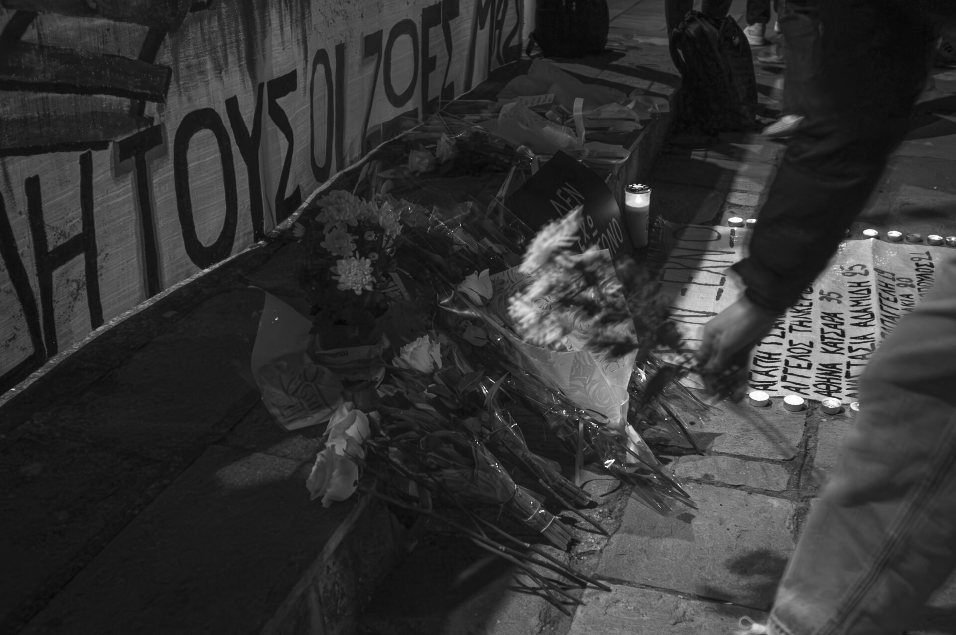 Το συγκεντρωμένο πλήθος άφησε λουλούδια και κεράκια, τα οποία παρέμειναν στο σημείο για όλο το βράδυ.