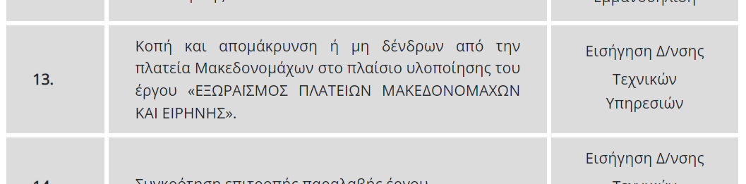 Μάλιστα, δεν είναι απίθανο να καταφέρουν να σωθούν τελικά τα δέντρα, αφού στην πρόσκληση για την 26η τακτική συνεδρίαση του δημοτικού συμβουλίου, το 13ο θέμα συζήτησης είναι η “κοπή και απομάκρυνση ή μη δένδρων από την πλατεία Μακεδονομάχων στο πλαίσιο του έργου “ΕΞΩΡΑΙΣΜΟΣ ΠΛΑΤΕΙΩΝ ΜΑΚΕΔΟΝΟΜΑΧΩΝ ΚΑΙ ΕΙΡΗΝΗΣ”. Αυτό το ή (διαζευκτικό) γεμίζει ελπίδα τους πολίτες ότι, ίσως τελικά καταφέρουν να περισώσουν τα δέντρα της πλατείας.