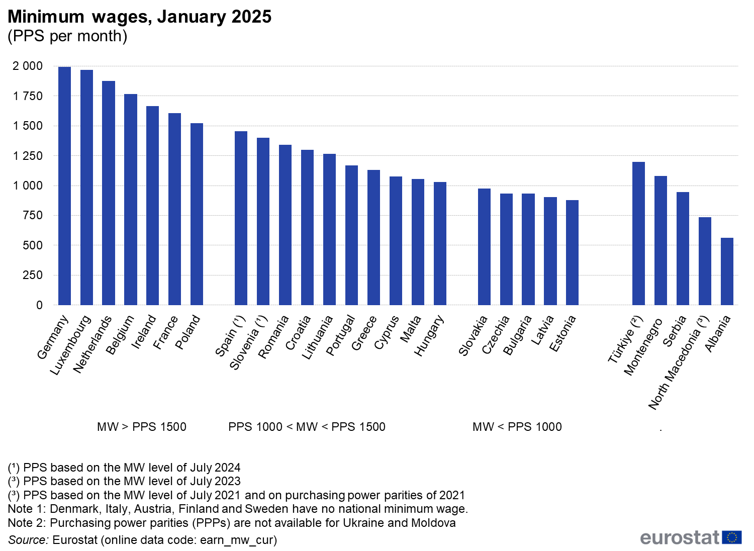 Ο κατώτατος μισθός έχει τη μεγαλύτερη αγοραστική δύναμη στη Γερμανία (1992 PPS), μπροστά από το Λουξεμβούργο, την Ολλανδία, το Βέλγιο, την Ιρλανδία και τη Γαλλία.