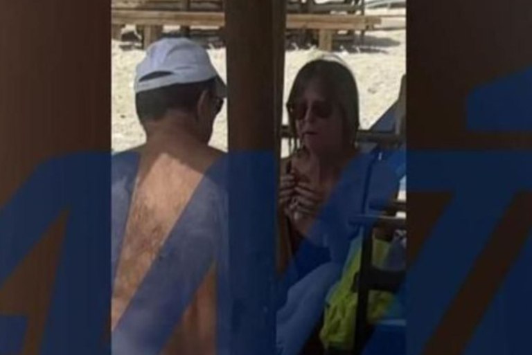 Η γυναίκα κάθεται σε παραλιακό μαγαζί με τον σύζυγό της και φαίνεται να τρώει κάτι. Η 59χρονη, η οποία φοράει σκούρο μαγιό και γυαλιά ηλίου, δείχνει ήρεμη καθώς συνομιλεί με τον σύζυγό της, που εικονίζεται στη φωτογραφία να φορά λευκό καπέλο.