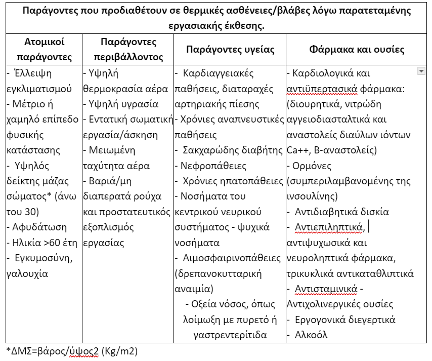 – παράγοντες κινδύνου για εκδήλωση ασθενειών/βλαβών που σχετίζονται με τη θερμότητα λόγω έκθεσης στο χώρο εργασίας , όπως 1) η έλλειψη εγκλιματισμού στις αυξημένες θερμοκρασίες, 2) το μέτριο ή χαμηλό επίπεδο φυσικής κατάστασης, 3) η αφυδάτωση, 4) η ηλικία>60 έτη, 5) ο υψηλός δείκτης μάζας σώματος (>30), 6) συγκεκριμένα υποκείμενα νοσήματα, 7) η λήψη ορισμένων ουσιών και φαρμάκων.