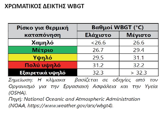 - Την τιμή βιοκλιματικού δείκτη WBGT, όταν αυτή είναι ανώτερη του 32,2 (σύμφωνα με το Παράρτημα ΙΙ) ή