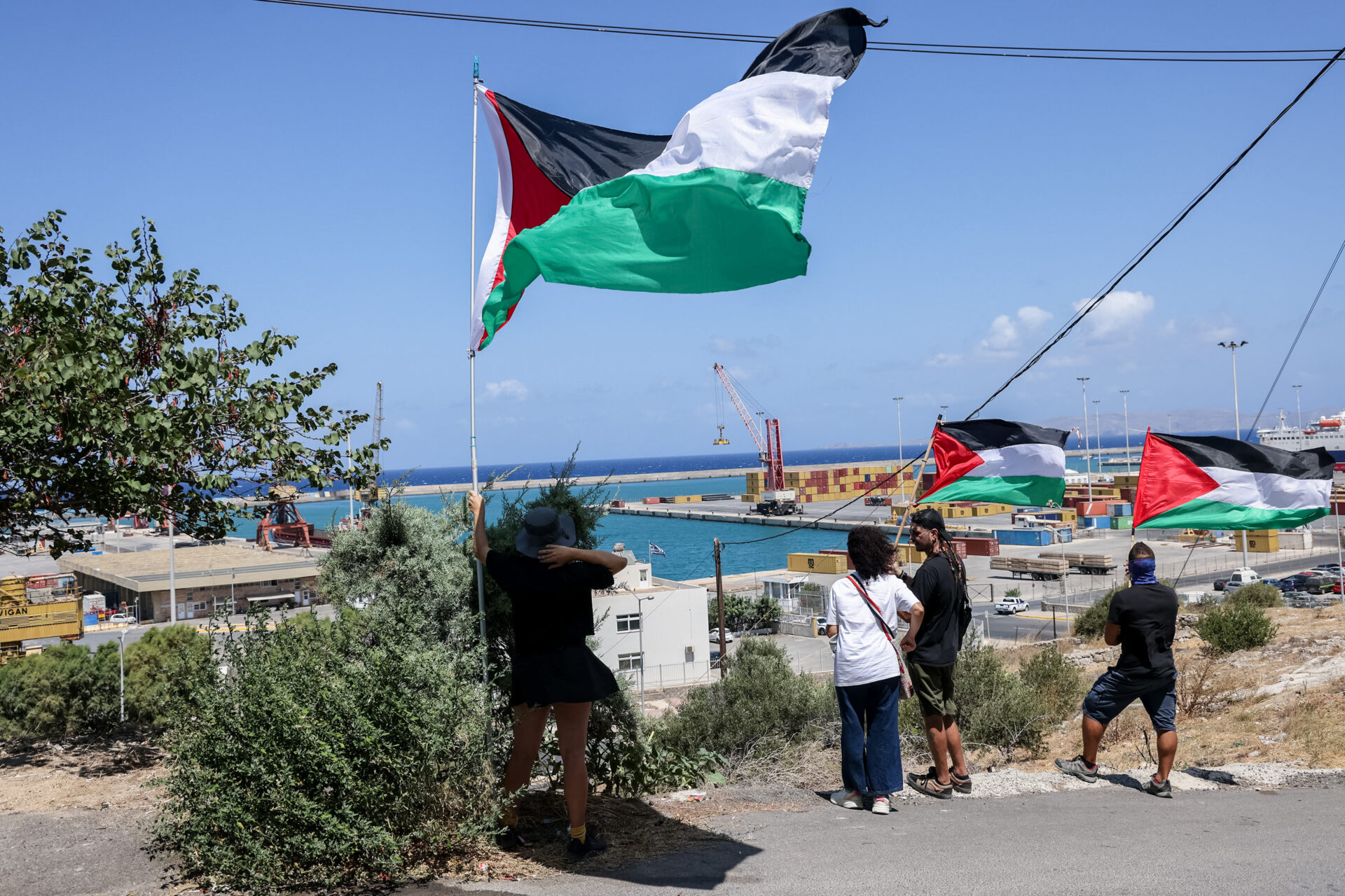 Με πανό, σημαίες της Παλαιστίνης και συνθήματα υποδέχθηκαν κάτοικοι της Κρήτης το ισραηλινό κρουαζιερόπλοιο Crown Iris, το οποίο έδεσε λίγο μετά τη 1 στο λιμάνι του Ηρακλείου.