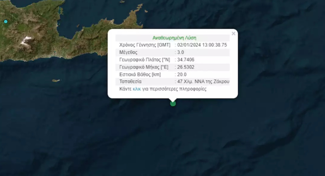 Πιο συγκεκριμένα, το επίκεντρο είναι στα 47 χιλιόμετρα νότια – νοτιοανατολικά της Ζάκρου σε θαλάσσια περιοχή.