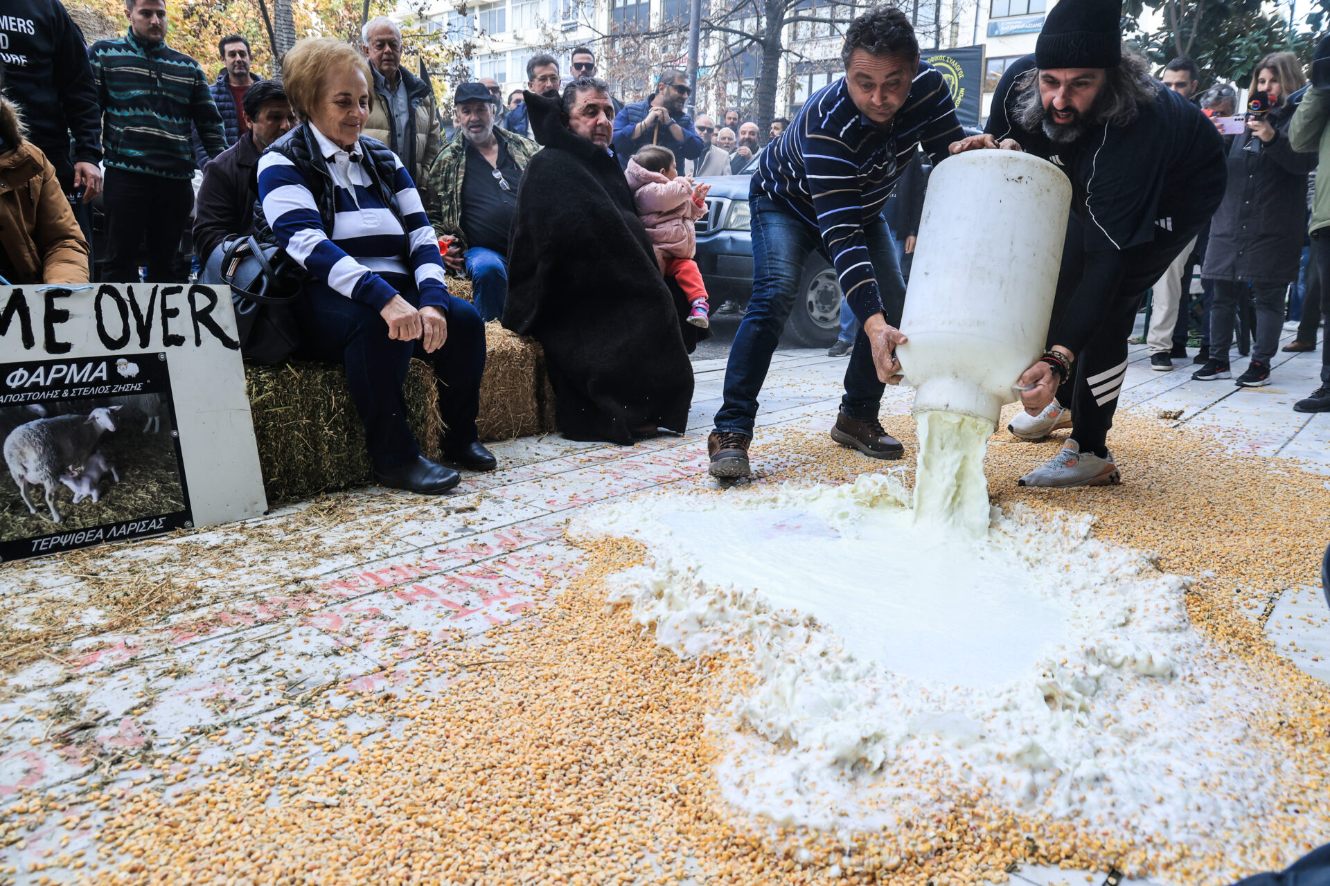 Κτηνοτρόφοι από την περιοχή της Λάρισας πραγματοποίησαν διαμαρτυρία χύνοντας γάλα στην κεντρική πλατεία, σε ένδειξη αγανάκτησης για τις δύσκολες συνθήκες που αντιμετωπίζουν.