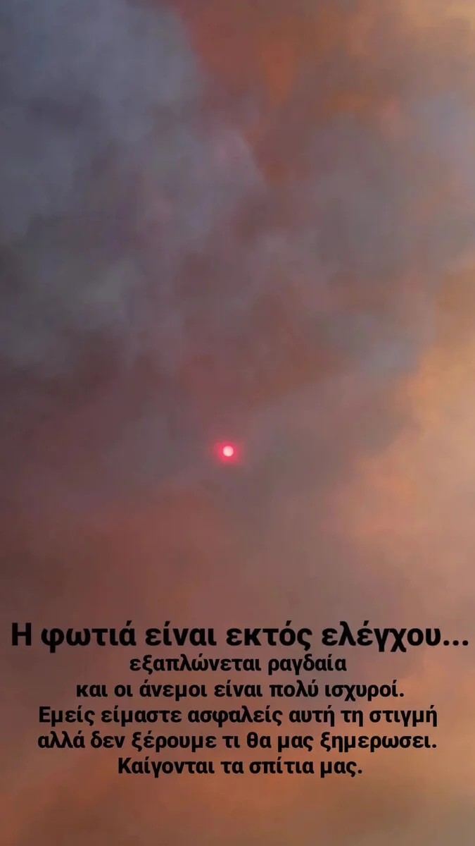 «Η φωτιά είναι εκτός ελέγχου, εξαπλώνεται ραγδαία και οι άνεμοι είναι πολύ ισχυροί. Εμείς είμαστε ασφαλείς αυτή τη στιγμή αλλά δεν ξέρουμε τι θα μας ξημερώσει. Καίγονται τα σπίτια μας».