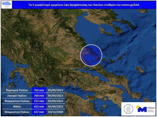 Ιδιαίτερη αναφορά γίνεται στο μετεωρολογικό σταθμό της Μακρινίτσας Πηλίου, ο οποίος μέχρι τις 20/09/2023 έχει καταγράψει αθροιστικό ύψος βροχόπτωσης 1235 χιλιοστά, τιμή που αποτελεί ήδη το μεγαλύτερο μηνιαίο ύψος βροχόπτωσης που έχει καταγραφεί ποτέ στην Ευρώπη. Το προηγούμενο ρεκόρ κατείχε η Ασκύφου Χανίων από το Φεβρουάριο του 2019, όταν είχε καταγράψει μηνιαίο ύψος βροχόπτωσης 1225 χιλιοστά.