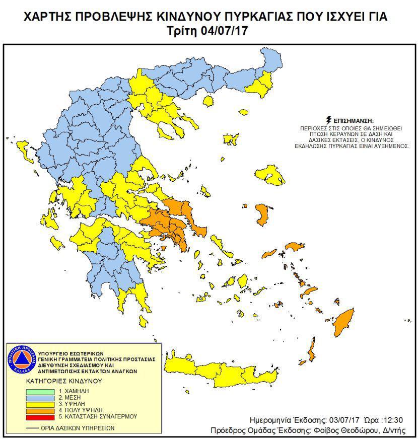 Παρακάτω ο χάρτης πρόβλεψης κινδύνου πυρκαγιάς που ισχύει για την Τρίτη 4 Ιουλίου 2017
