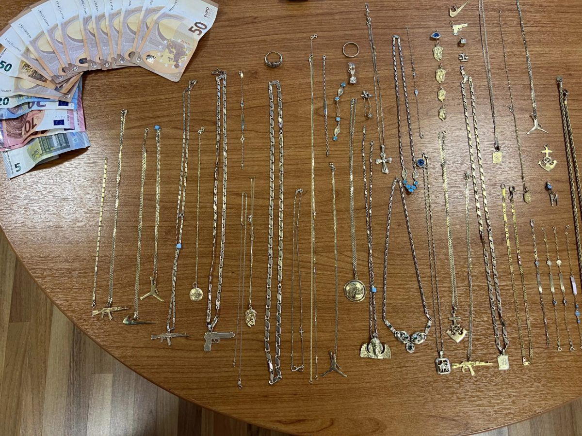 - 57 κοσμήματα χρυσού χρώματος (αλυσίδες και κολιέ με μενταγιόν, δαχτυλίδια, βέρες, σκουλαρίκια (σε ζεύγη), βραχιόλια)