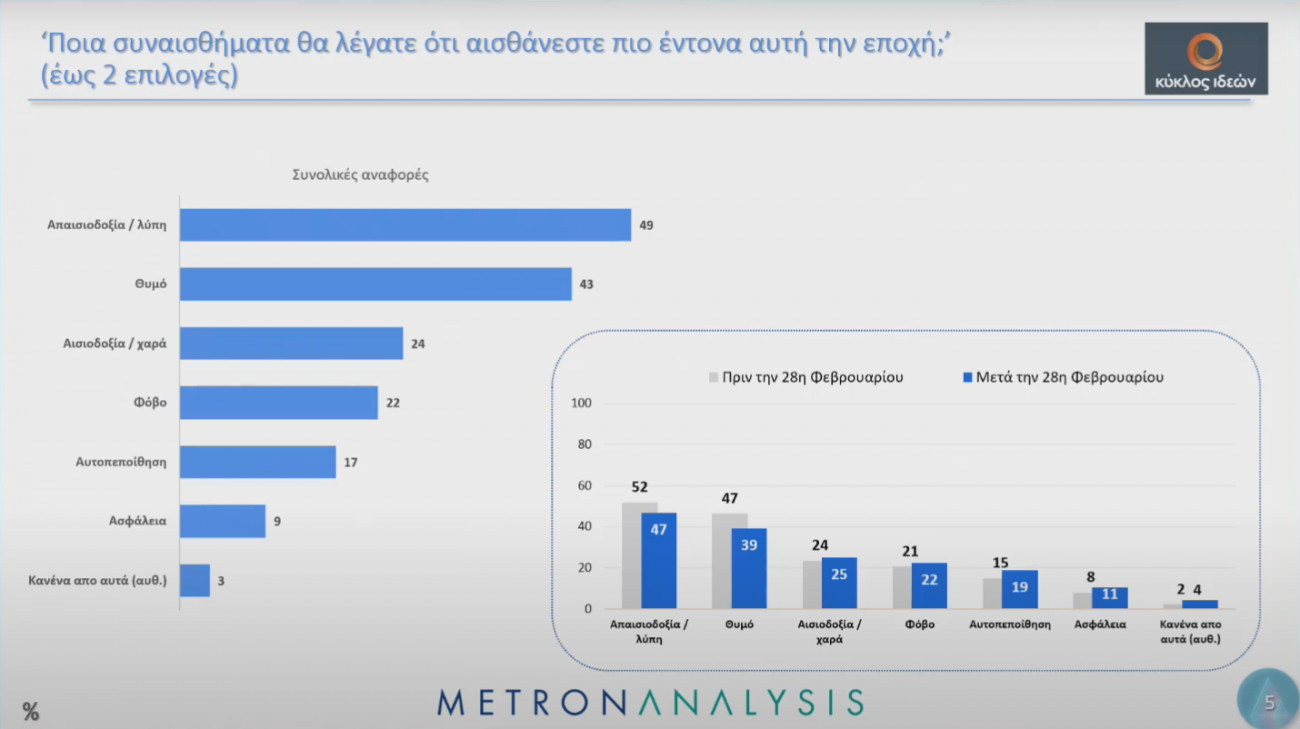 Σύμφωνα με τα ευρήματα της έρευνας, οι Έλληνες αισθάνονται απαισιοδοξία και θυμό, που συνδέονται σε μεγάλο βαθμό με την υπόθεση των Τεμπών