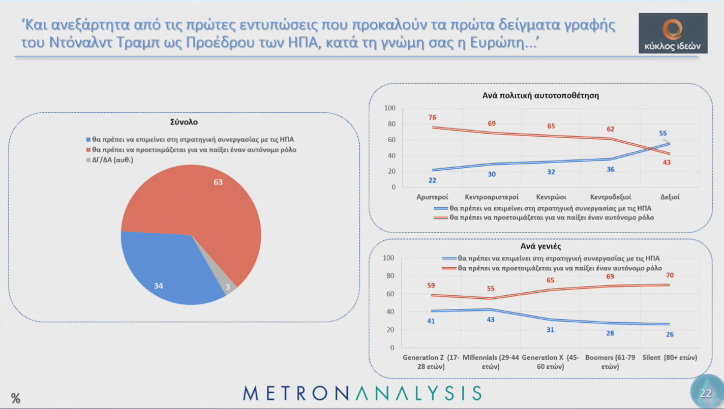Ως προς το διεθνές περιβάλλον, σύμφωνα με τη έρευνα της ΜETRON ANALYSIS , η πολιτική Τραμπ επιδρά ήδη στις αντιλήψεις των πολιτών. Θεωρείται απειλή για τη χώρα μας (με 31%, μετά την «παραδοσιακή» απειλή της Τουρκίας με 52%) και αναμένεται να επηρεάσει αρνητικά ιδίως τις σχέσεις των ΗΠΑ με την Ευρώπη αλλά και της Δύσης με τον υπόλοιπο κόσμο. Έτσι, αναδεικνύεται μια σαφής προτίμηση για μεγαλύτερη στρατηγική αυτονομία της ΕΕ έναντι της συνεργασίας με τις ΗΠΑ (63% έναντι 34%).