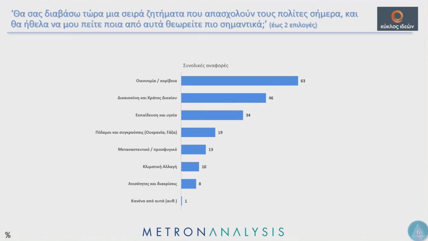 Τα κύρια αντιλαμβανόμενα προβλήματα αφορούν την Οικονομία-Ακρίβεια (63% στις συνολικές αναφορές) και το Κράτος Δικαίου (46%), το οποίο συνδέεται σαφώς με τις μαζικές κινητοποιήσεις για τα Τέμπη που θεωρείται ότι έγιναν με κυρίαρχο αίτημα την απόδοση δικαιοσύνης.