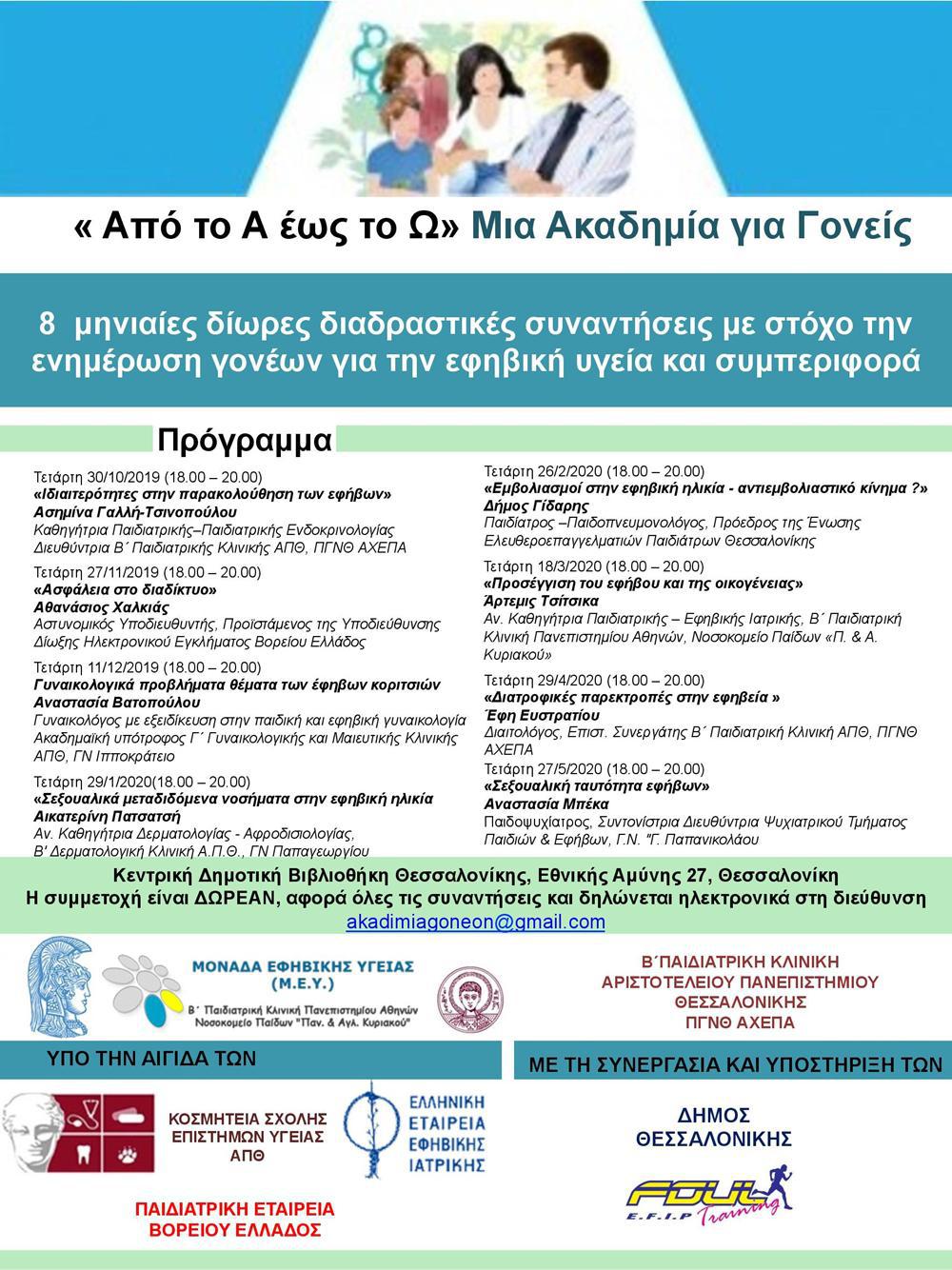 Με στόχο την ενημέρωση και την στήριξη των γονέων σε θέματα συμπεριφοράς και υγείας κατά την εφηβική ηλικία θα λειτουργήσει στη Θεσσαλονίκη από τις 30 Οκτωβρίου 2019 έως τις 27 Μαΐου 2020 το πρόγραμμα “Από το Α έως το Ω. Μία Ακαδημία για Γονείς” της Μονάδας Εφηβικής Υγείας της Β ́ Παιδιατρικής Κλινικής του Πανεπιστημίου Αθηνών, του Νοσοκομείου Παίδων «Π.&Α. Κυριακού».